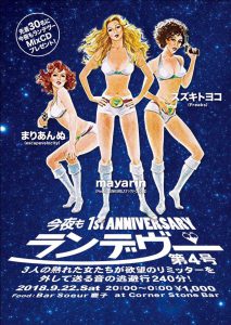 DJ: mayarin(FREAKS OSAKA/JUNKERS/スナックいくくる), まりあんぬ(escapevelocity), スズキトヨコ(FREAKS OSAKA) Food: bar Soeur(スール) 慶子