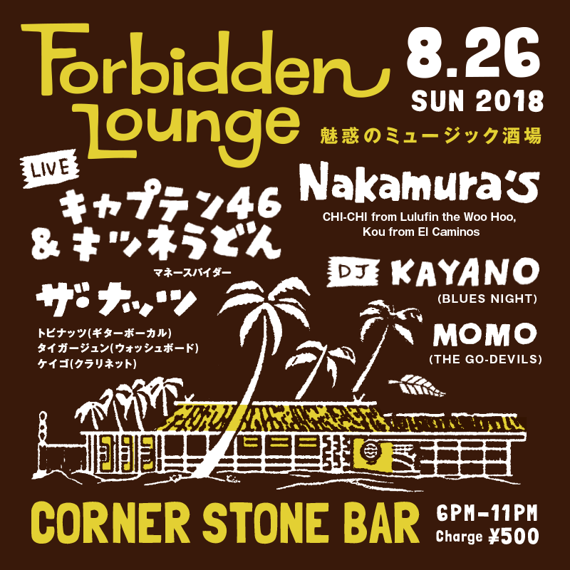Live: キャプテン46 & キツネうどん(マネースパイダー), Nakamura’s(CHI-CHI from Lulufin the Woo Hoo, Kou from El Caminos), ザ・ナッツ(トビナッツ-ギター/ヴォーカル-, タイガージュン-ウォッシュボード-, ケイゴ-クラリネット-)