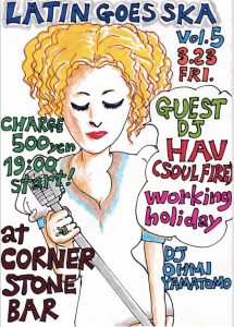 [ Latin Goes Ska vol.5 ] 3/23(Fri) 「Latin Goes Ska vol.5」 Start 19:00 Close 0:00 Charge: 500yen Guest: HAV(Soul Fire), Working Holiday DJ: Ohmi(Soulful I), Yamatomo(Right On) Loading Map.... Corner Stone Bar西区南堀江2-13-26 2F - 大阪市イベント 34.672643970862076 135.49105533670127 日時 2018/03/237:00 PM 〜 場所 Corner Stone Bar