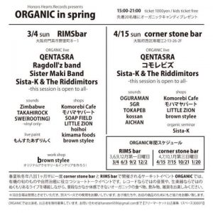 年間schedulesRIMS bar3,6,9,12月第一日曜日3/4,6/3,9/2,12/2corner stone bar4,7,10,1月第三日曜日4/15,7/15,10/21,1/20ORGANICでは出演者、出店者を随時募集しています。お問い合わせはhanaten9396@gmail.co